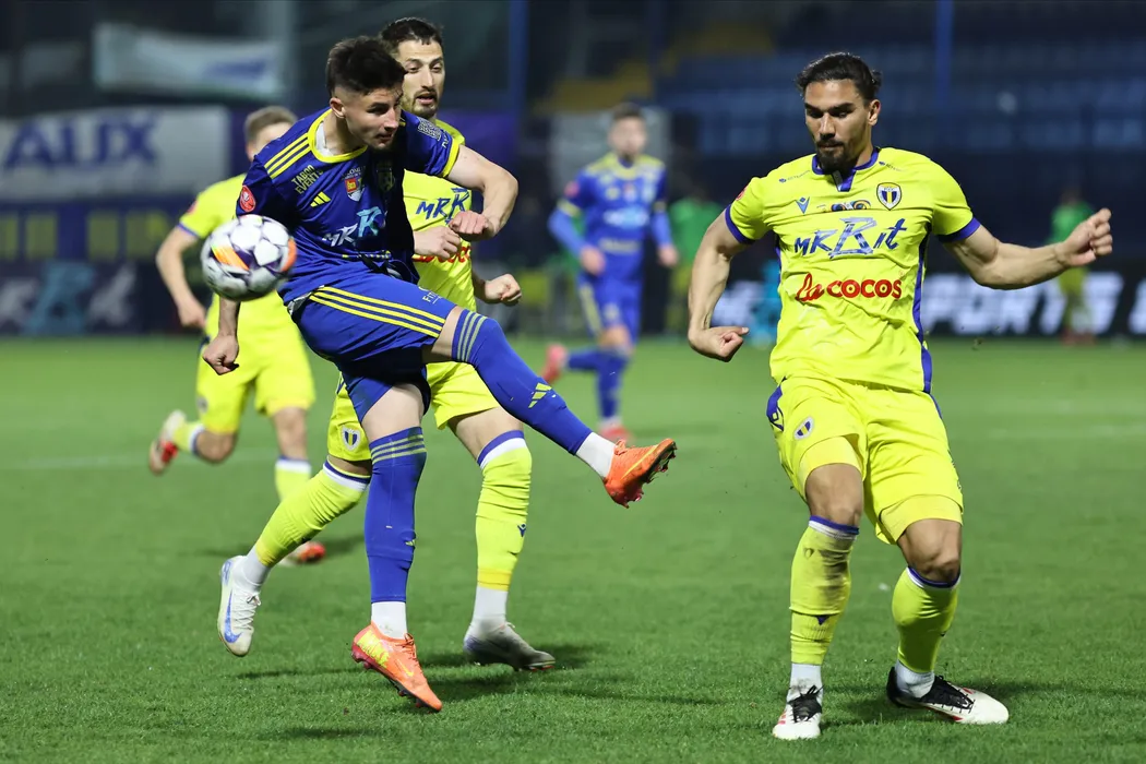 Andrei Cristian Dorobantu si Marian Fernando Huja, Gheorghe Teodor Grozav in meciul de fotbal dintre AFC Unirea 04 Slobozia si FC Petrolul Ploiesti, contand pentru SuperLiga Superbet - Play-Out, desfasurat pe Clinceni Arena din Clinceni, vineri 28 martie 2025. © FOTO: Gheorghe Fluster/SPORT PICTURES