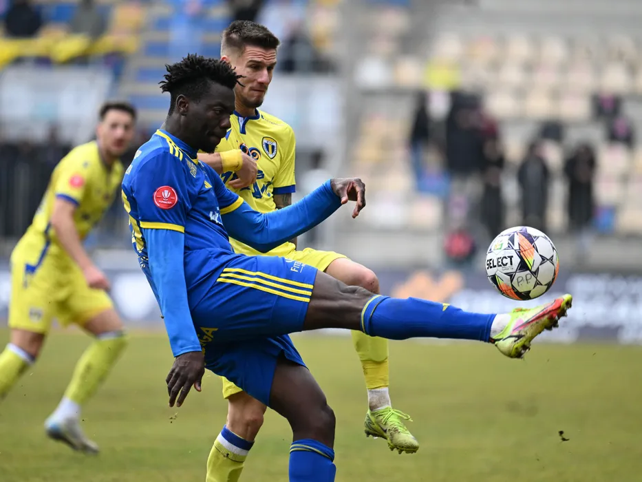 Nkama Christ Afalna si Mihnea Gabriel Radulescu in meciul de fotbal dintre Petrolul Ploiesti si Unirea Slobozia, din cadrul Superligii Superbet desfasurat pe Stadionul Ilie Oana din Ploiesti, duminica 22 decembrie 2024. © FOTO:Razvan Pasarica/SPORT PICTURES
