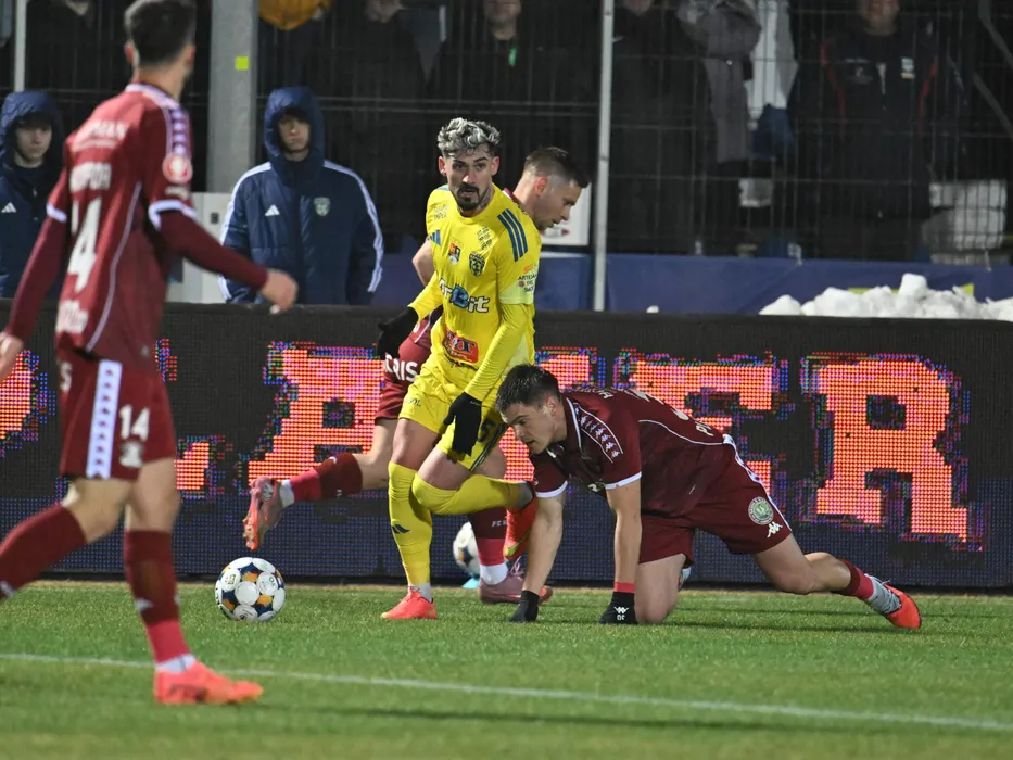Alexandru Cristian Albu si George Daniel Paraschiv in meciul dintre Unirea Slobozia si Rapid Bucuresti, contand pentru Superliga Superbet, desfasurat pe Stadionul 1 Mai din Slobozia, luni 2 martie 2026. © FOTO:Razvan Pasarica/SPORT PICTURES