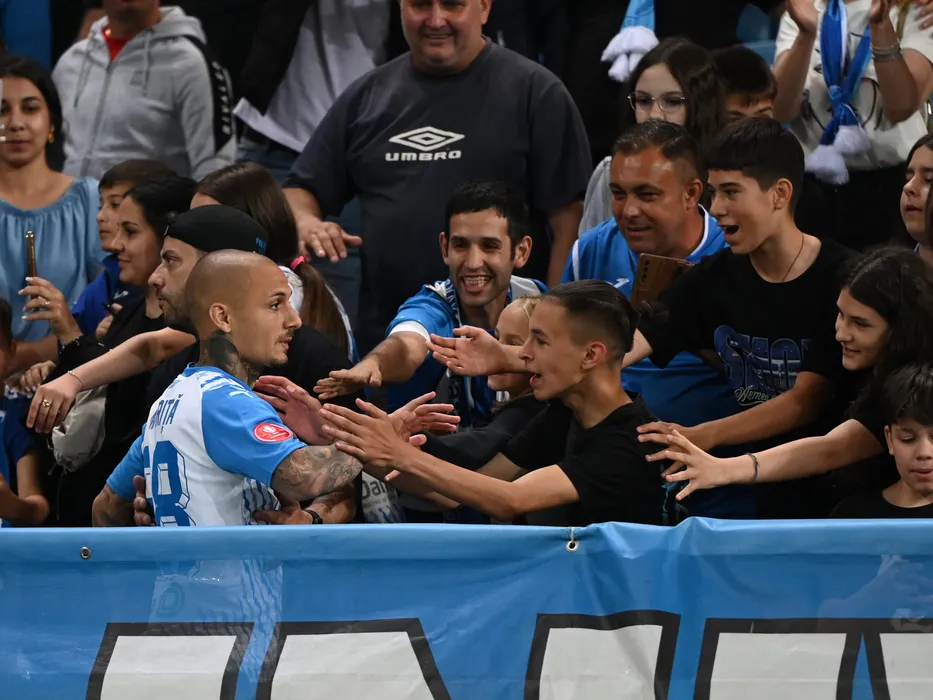 Ionuț Alexandru Mitriță asaltat de fani în peluza dupa meciul de fotbal dintre Universitatea Craiova si Universitatea Cluj, barajul pentru calificarea in preliminariile Conference League, desfășurat pe Stadionul Ion Oblemenco din Craiova, duminica 26 mai 2024. © FOTO: Răzvan PĂSĂRICĂ/SPORT PICTURES