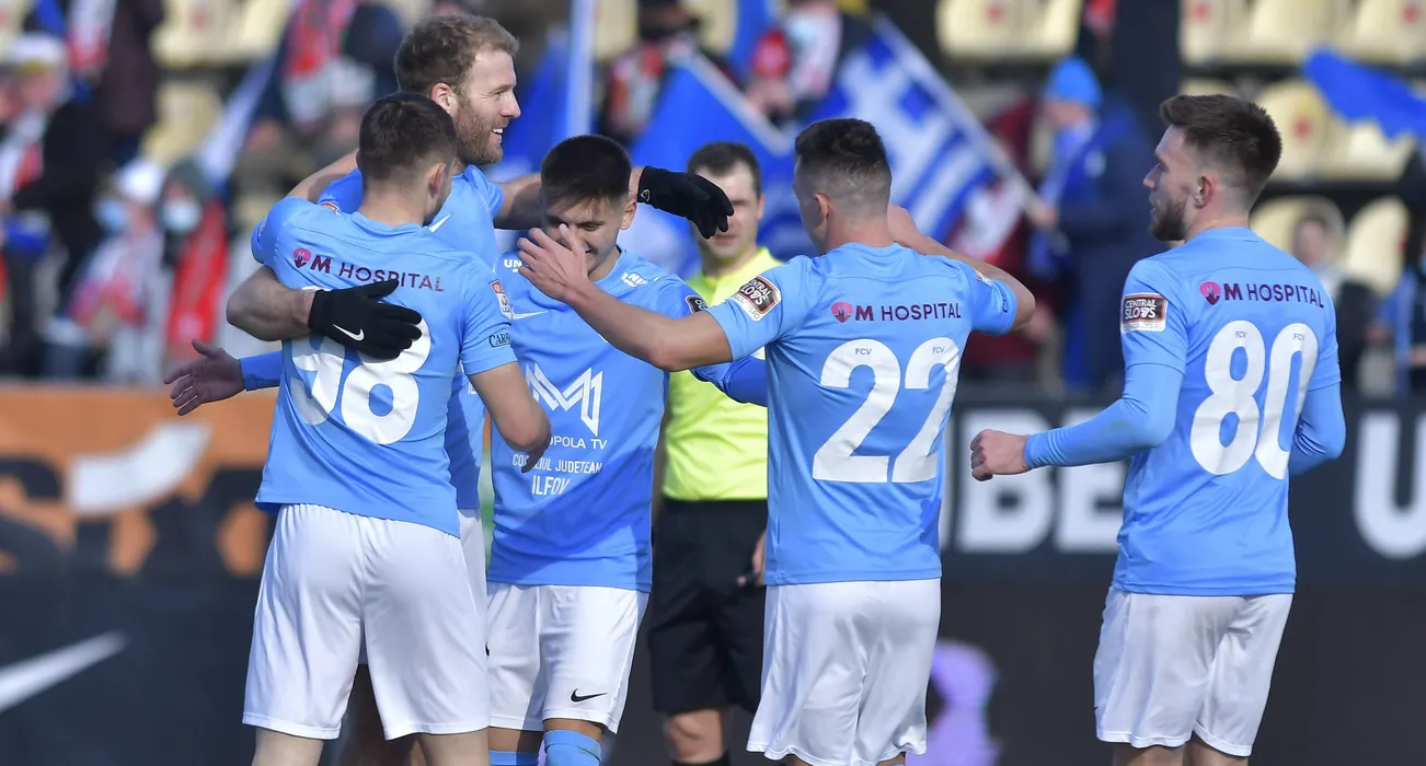 Bucurie a fotbalistilor voluntareni dupa un gol marcat cu Adam Nemec, Ion Gheorghe si Lorand Levente Fulop in meciul de fotbal dintre FC Voluntari si Gaz Metan Medias, contand pentru Liga 1 Casa Pariurilor, desfasurat pe Stadionul Anghel Iordanescu din Voluntari, sambata 29 ianuarie 2022. © FOTO:Razvan Pasarica/SPORT PICTURES