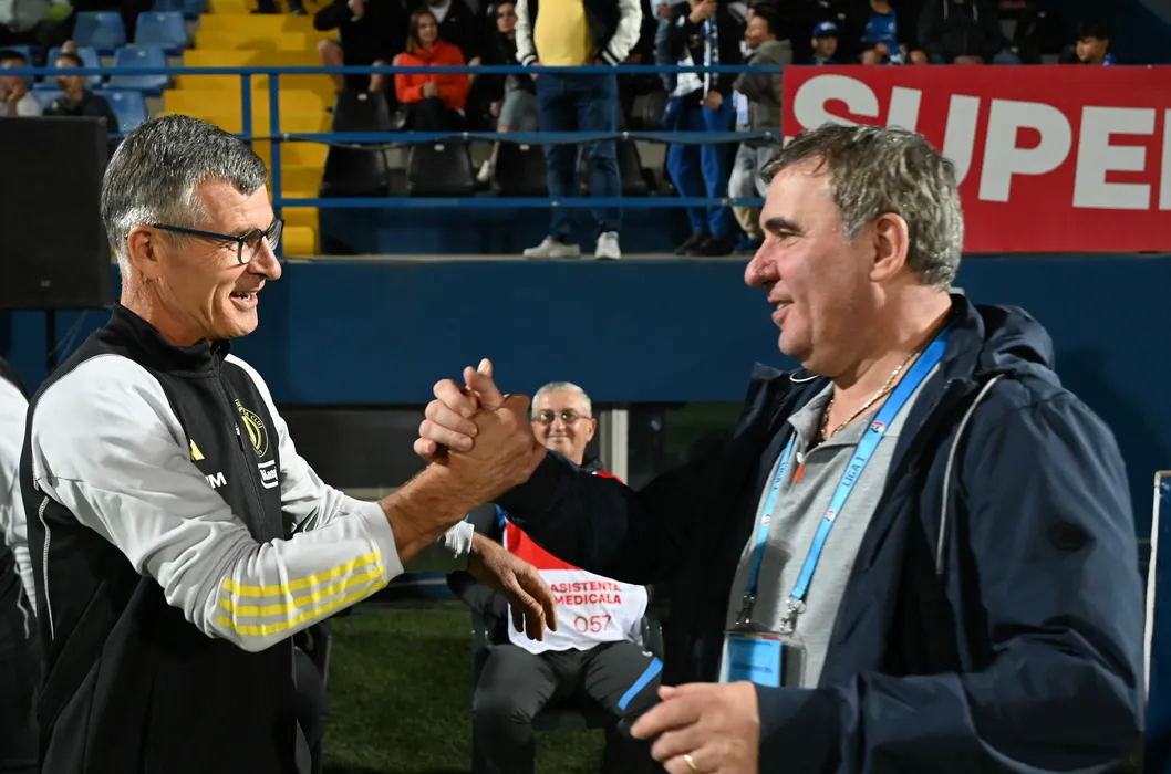 Cei doi antrenori Gheorghe Hagi si Ovidiu Ioan Sabau se saluta inaintea meciului de fotbal dintre Farul Constanta si Universitatea Cluj, contand pentru Superliga Superbet, desfasurat pe Stadionul central al Academiei Gheorghe Hagi din Ovidiu, sambata 21 octombrie 2023. © FOTO:Razvan Pasarica/SPORT PICTURES