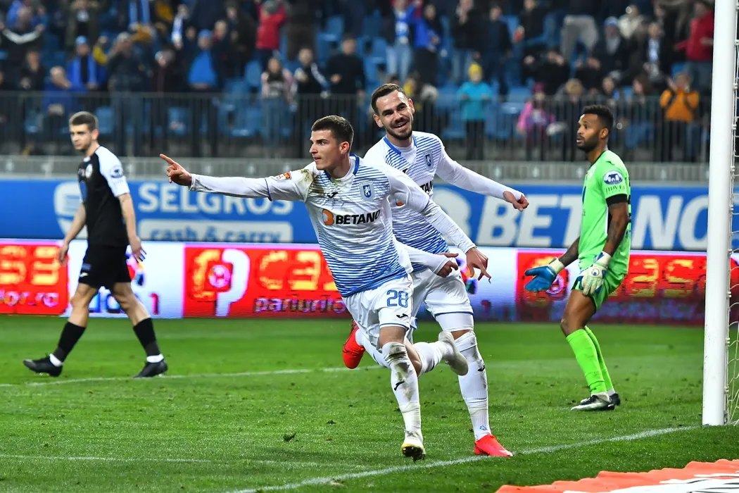 Valentin Mihaila (S), de la Universitatea Craiova, reactioneaza dupa ce a inscris un gol in timpul meciului de fotbal contra echipei Gaz metan Medias, din prima etapa a play - off - ului Ligii 1, disputat la stadionul Ion Oblemenco din Craiova, duminica, 1 martie 2020. REMUS BADEA / MEDIAFAX FOTO