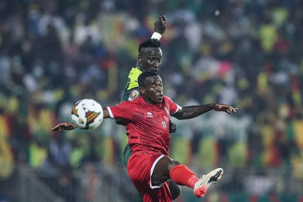 Equatorial Guinea's defender Basilio Ndong (R) and Senegal's forward Famara Diedhiou jump for the ball during the Africa Cup of Nations (CAN) 2021 quarter-final football match between Senegal and Equatorial Guinea at Stade Ahmadou Ahidjo in Yaounde on January 30, 2022.,Image: 657767277, License: Rights-managed, Restrictions: , Model Release: no