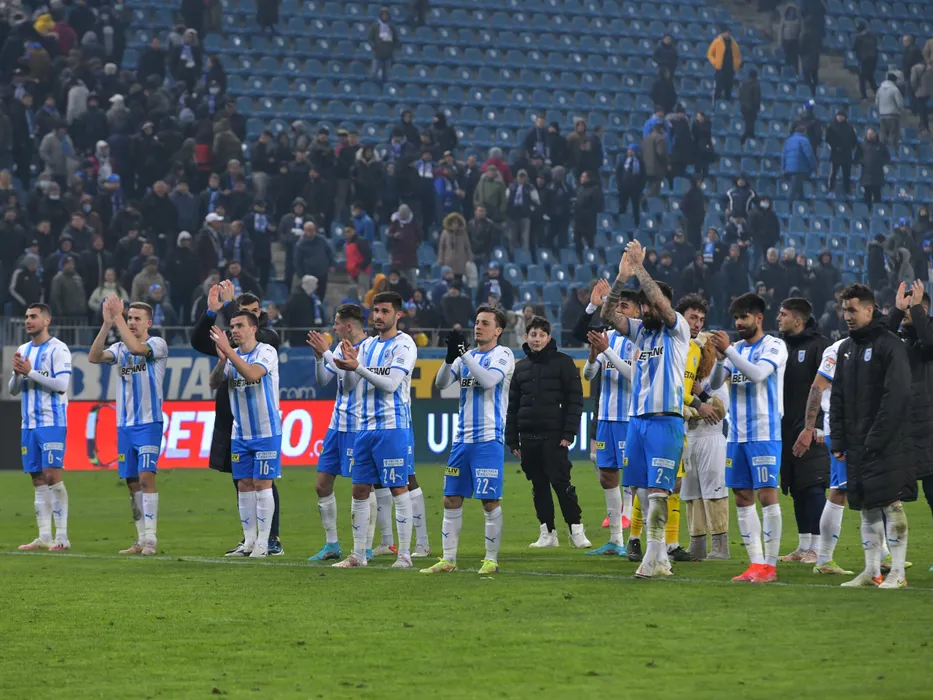 Fotbalistii craioveni Screciu Vladimir Ionut, Nicusor Silviu Bancu, Dan Nicolae Nistor, Ante Roguljic, Gustavo Vagenin, Paul Papp si Ionut Daniel Vina saluta galeria dupa meciul de fotbal dintre Universitatea Craiova si Chindia Targoviste, contand pentru Liga 1 Casa Pariurilor, desfasurat pe Stadionul Ion Oblemenco din Craiova, vineri 25 februarie 2022. © FOTO:Razvan Pasarica/SPORT PICTURES