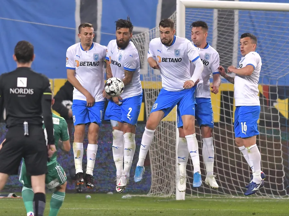 Zid craiovean format din Nicusor Silviu Bancu, Paul Papp, Alexandru Tudorie, Alexandru Mateiu si Dan Nicolae Nistor in meciul de fotbal dintre Universitatea Craiova si Sepsi OSK Sfantu Gheorghe, contand pentru Play-off-ul Ligii 1 Casa Pariurilor, desfasurat fara spectatori pe Stadionul Ion Oblemenco din Craiova, sambata 17 aprilie 2021. © FOTO:Razvan Pasarica/SPORT PICTURES