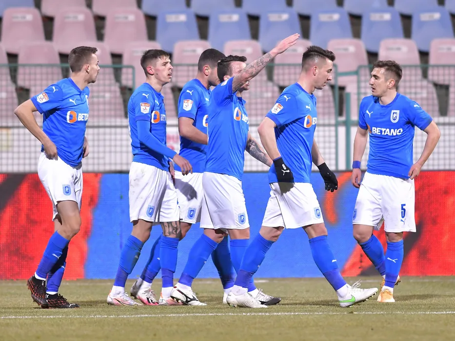 Bucurie a fotbalistilor craioveni dupa un gol marcat cu Mihai Alexandru Balasa, Alexandru George Cimpanu, Bogdan Ilie Vatajelu, Paul Papp si Andrei Virgil Ivan in meciul de fotbal dintre Chindia Targoviste si Universitatea Craiova, contand pentru Cupa Romaniei, desfasurat pe Stadionul Gloria din Buzau, marti 2 martie 2021. © FOTO:Razvan Pasarica/SPORT PICTURES