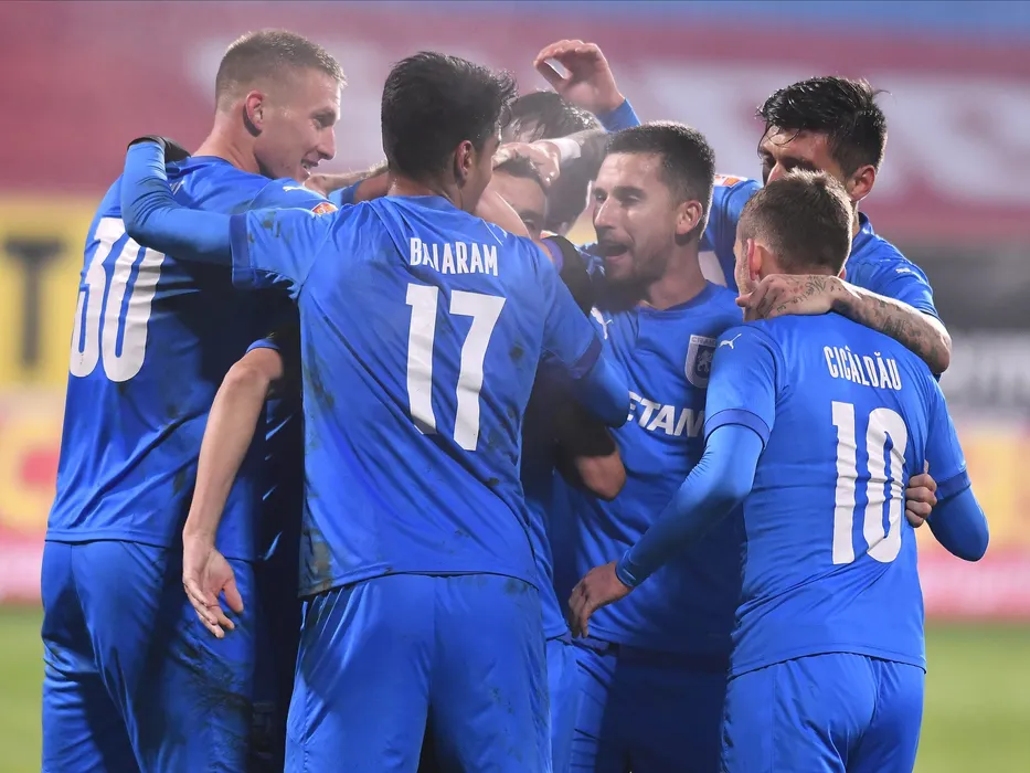 Bucurie a fotbalistilor craioveni cu Ivan Mamut, Ovidiu Alexandru Bic si Paul Papp dupa un gol marcat in meciul de fotbal dintre FC Hermannstadt si Universitatea Craiova, contand pentru Liga 1 Casa Pariurilor, desfasurat fara spectatori pe Stadionul Municipal din Medias, sambata 31 octombrie 2020. © FOTO:Razvan Pasarica/SPORT PICTURES