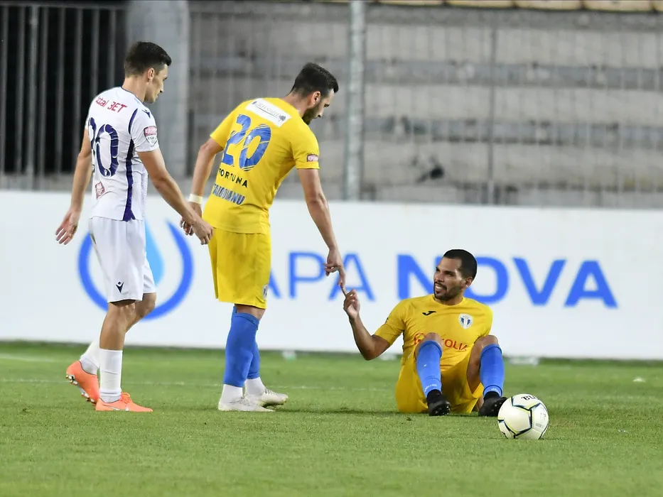 Nicolae Musat, Stefan Nicolae Barboianu si Derlis David Meza Colli se saluta dupa meciul de fotbal dintre Petrolul Ploiesti si FC Arges, contand pentru play-off-ul de promovare a Ligii a-2-a Casa Pariurilor, disputat fara spectatori pe Stadionul Ilie Oana din Ploiesti, marti 28 iulie 2020. © FOTO:Razvan Pasarica/SPORT PICTURES