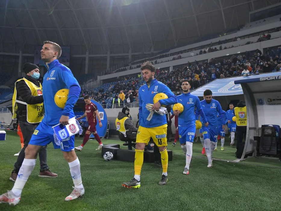 Fotbalistii craioveni printre care Nicusor Silviu Bancu, Mirko Pigliacelli si Andrei Virgil Ivan la startul meciului de fotbal dintre Universitatea Craiova si CFR Cluj, contand pentru Liga 1 Casa Pariurilor, desfasurat pe Stadionul Ion Oblemenco din Craiova, sambata 5 februarie 2022. © FOTO:Razvan Pasarica/SPORT PICTURES