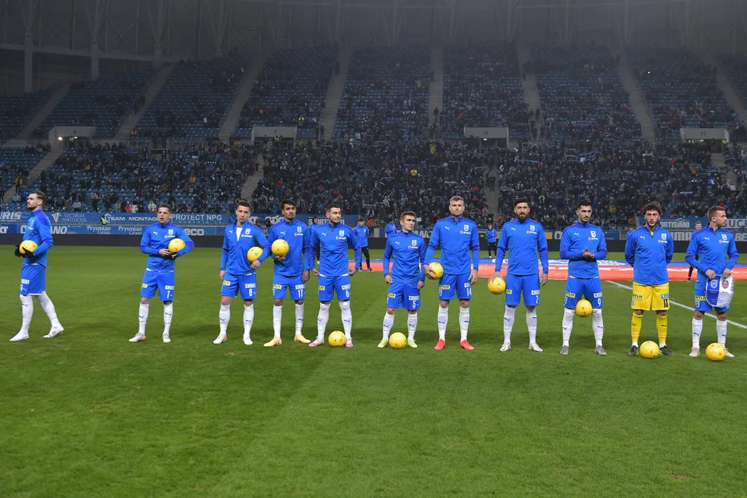 Fotbalistii craioveni la startul meciului de fotbal dintre Universitatea Craiova si CFR Cluj, contand pentru Liga 1 Casa Pariurilor, desfasurat pe Stadionul Ion Oblemenco din Craiova, sambata 5 februarie 2022. © FOTO:Razvan Pasarica/SPORT PICTURES