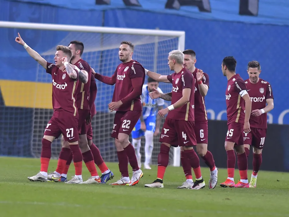 Bucurie a fotbalistilor clujeni Gabriel Debeljuh, Cristian Marian Manea si Ciprian Ioan Deac dupa un gol marcat de catre Claudiu Adrian Mihai Petrila in meciul de fotbal dintre Universitatea Craiova si CFR Cluj, contand pentru Liga 1 Casa Pariurilor, desfasurat pe Stadionul Ion Oblemenco din Craiova, sambata 5 februarie 2022. © FOTO:Razvan Pasarica/SPORT PICTURES