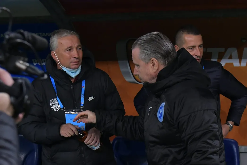 Cei doi antrenori Dan Petrescu si Laurentiu Aurelian Reghecampf se saluta inaintea meciului de fotbal dintre Universitatea Craiova si CFR Cluj, contand pentru Liga 1 Casa Pariurilor, desfasurat pe Stadionul Ion Oblemenco din Craiova, sambata 5 februarie 2022. © FOTO:Razvan Pasarica/SPORT PICTURES