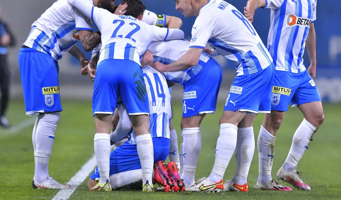 Bucurie a fotbalistilor craioveni dupa un gol marcat cu Paul Papp, Alexandru Mateiu si Screciu Vladimir Ionut in meciul de fotbal dintre Universitatea Craiova si CFR Cluj, contand pentru Play-off-ul Ligii 1 Casa Pariurilor, desfasurat pe Stadionul Ion Oblemenco din Craiova, duminica 10 aprilie 2022. © FOTO:Razvan Pasarica/SPORT PICTURES
