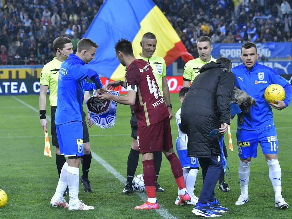 Brigada de arbitrii formata din Marius Mihail Marica, Radu Petrescu si Ferencz Tunyogi alaturi de capitanii Nicusor Silviu Bancu si Mario Camora sub privirile lui Dan Nicolae Nistor in meciul de fotbal dintre Universitatea Craiova si CFR Cluj, contand pentru Play-off-ul Ligii 1 Casa Pariurilor, desfasurat pe Stadionul Ion Oblemenco din Craiova, duminica 10 aprilie 2022. © FOTO:Razvan Pasarica/SPORT PICTURES