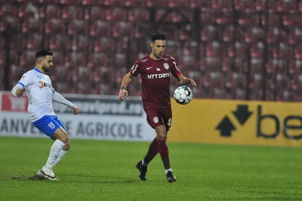 Mario Camora (D), de la CFR Cluj, suteaza in timpul meciului de fotbal contra echipei Universitatea Craiova din etapa a XV-a a Ligii 1, disputat pe stadionul Dr. Constantin Radulescu din Cluj-Napoca, marti, 22 decembrie 2020. DAN HORIA TAUTAN / MEDIAFAX FOTO
