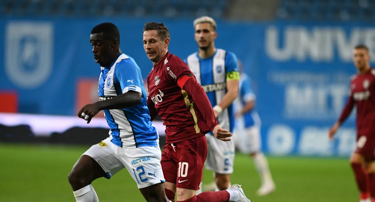 Basilio Ndong Owono Nchama si Ciprian Ioan Deac in meciul de fotbal dintre Universitatea Craiova si CFR Cluj, contand pentru Play-off-ul Superligii Superbet, desfasurat pe Stadionul Ion Oblemenco din Craiova, duminica 2 aprilie 2023. © FOTO:Razvan Pasarica/SPORT PICTURES