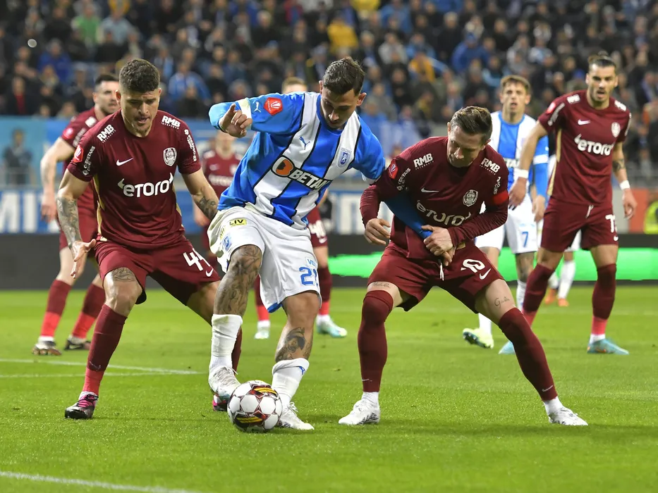 Jefferson Yuri De Sousa Matias, Jovan Markovic si Ciprian Ioan Deac in meciul de fotbal dintre Universitatea Craiova si CFR Cluj, contand pentru Play-off-ul Superligii Superbet, desfasurat pe Stadionul Ion Oblemenco din Craiova, duminica 2 aprilie 2023. © FOTO:Razvan Pasarica/SPORT PICTURES