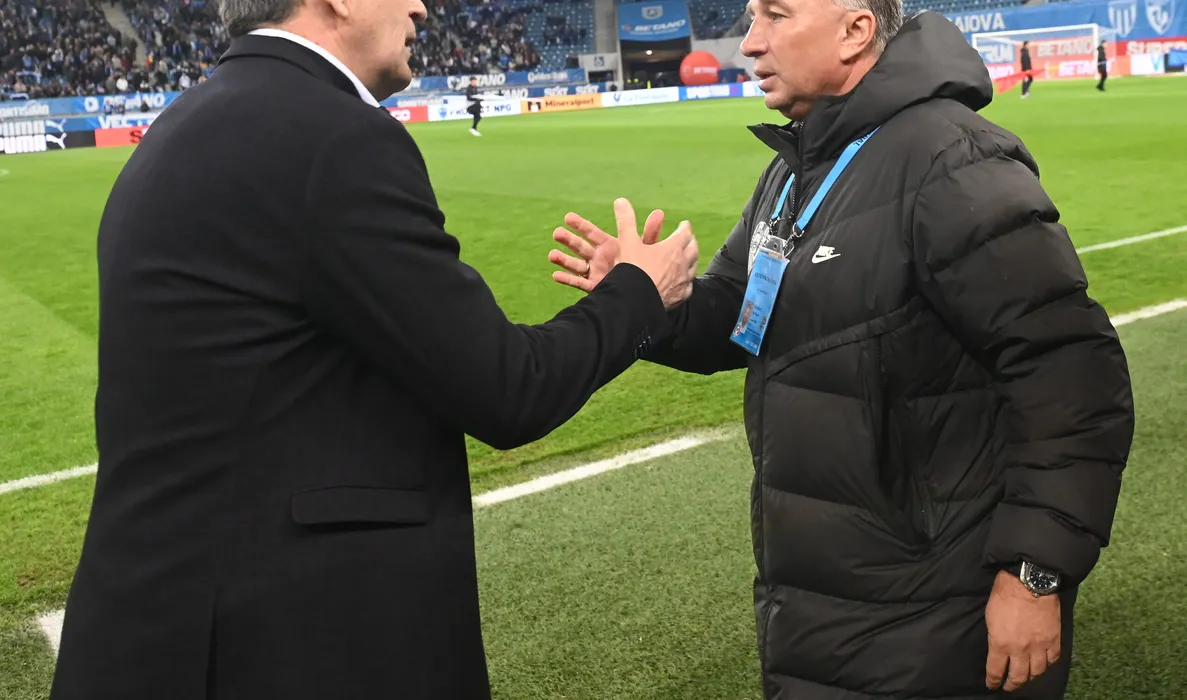 Cei doi antrenori Eugen Neagoe si Dan Petrescu se saluta inaintea meciului de fotbal dintre Universitatea Craiova si CFR Cluj, contand pentru Play-off-ul Superligii Superbet, desfasurat pe Stadionul Ion Oblemenco din Craiova, duminica 2 aprilie 2023. © FOTO:Razvan Pasarica/SPORT PICTURES
