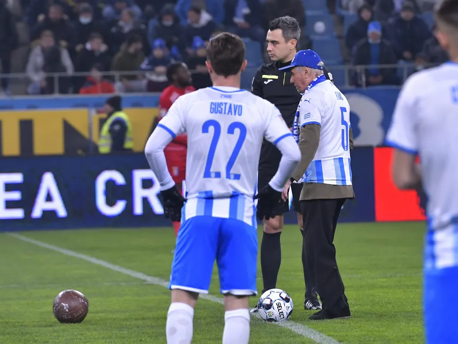 Fosta legenda craioveana Ion Briac da lovitura de start la meciul de fotbal dintre Universitatea Craiova si Chindia Targoviste, contand pentru Liga 1 Casa Pariurilor, desfasurat pe Stadionul Ion Oblemenco din Craiova, vineri 25 februarie 2022. © FOTO:Razvan Pasarica/SPORT PICTURES
