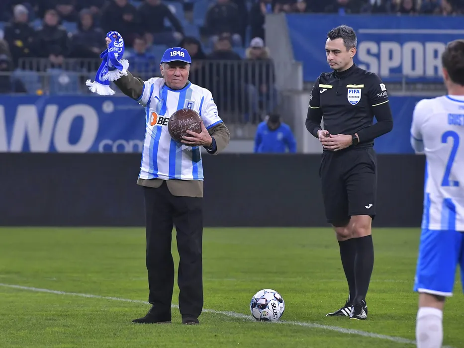 Fosta legenda craioveana Ion Briac alaturi de arbitrul central Horatiu Mircea Fesnic da lovitura de start la meciul de fotbal dintre Universitatea Craiova si Chindia Targoviste, contand pentru Liga 1 Casa Pariurilor, desfasurat pe Stadionul Ion Oblemenco din Craiova, vineri 25 februarie 2022. © FOTO:Razvan Pasarica/SPORT PICTURES