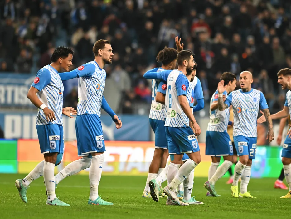 Bucurie a fotbaliștilor craioveni Manguia Denil Omar Maldonado, Elvir Koljic si Screciu Vladimir Ionuț după un gol marcat în meciul de fotbal dintre Universitatea Craiova si FC Voluntari, contând pentru Superliga Superbet, desfășurat pe Stadionul Ion Oblemenco din Craiova, luni 26 februarie 2024. © FOTO: Răzvan PĂSĂRICĂ/SPORT PICTURES