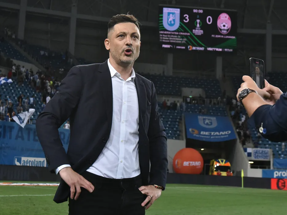 Noul antrenor al Craiovei, Mirel Radoi, se bucura alaturi de tabela de marcaj dupa meciul de fotbal dintre Universitatea Craiova si FC Zorya Luhansk, din cadrul UEFA Europa Conference League, desfasurat pe Stadionul Ion Oblemenco din Craiova, joi 11 august 2022. © FOTO:Razvan Pasarica/SPORT PICTURES