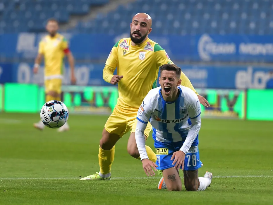 Daniel Marius Serbanica il faulteaza in careu pe Alexandru George Cimpanu in meciul de fotbal dintre Universitatea Craiova si CS Mioveni, contand pentru Liga 1 Casa Pariurilor, desfasurat pe Stadionul Ion Oblemenco din Craiova, sambata 30 octombrie 2021. © FOTO:Razvan Pasarica/SPORT PICTURES