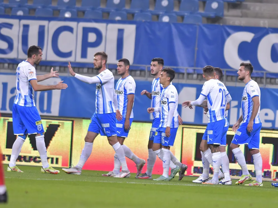 Bucurie a fotbalistilor craioveni dupa un gol marcat cu Alexandru Cretu, Screciu Vladimir Ionut, Andrei Virgil Ivan, Lyes Hafid Houri, Dan Nicolae Nistor, Mihai Cristian Capatina, Nicusor Silviu Bancu si Elvir Koljic in meciul de fotbal dintre Universitatea Craiova si CS Mioveni, contand pentru Liga 1 Casa Pariurilor, desfasurat pe Stadionul Ion Oblemenco din Craiova, sambata 30 octombrie 2021. © FOTO:Razvan Pasarica/SPORT PICTURES