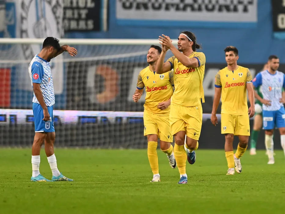 Lucian Mihai Dumitriu si Marian Fernando Huja se bucura dupa un gol marcat in meciul de fotbal dintre Universitatea Craiova si Petrolul Ploiesti, contand pentru Superliga Superbet, desfasurat pe Stadionul Ion Oblemenco din Craiova, duminica 22 octombrie 2023. © FOTO:Razvan Pasarica/SPORT PICTURES