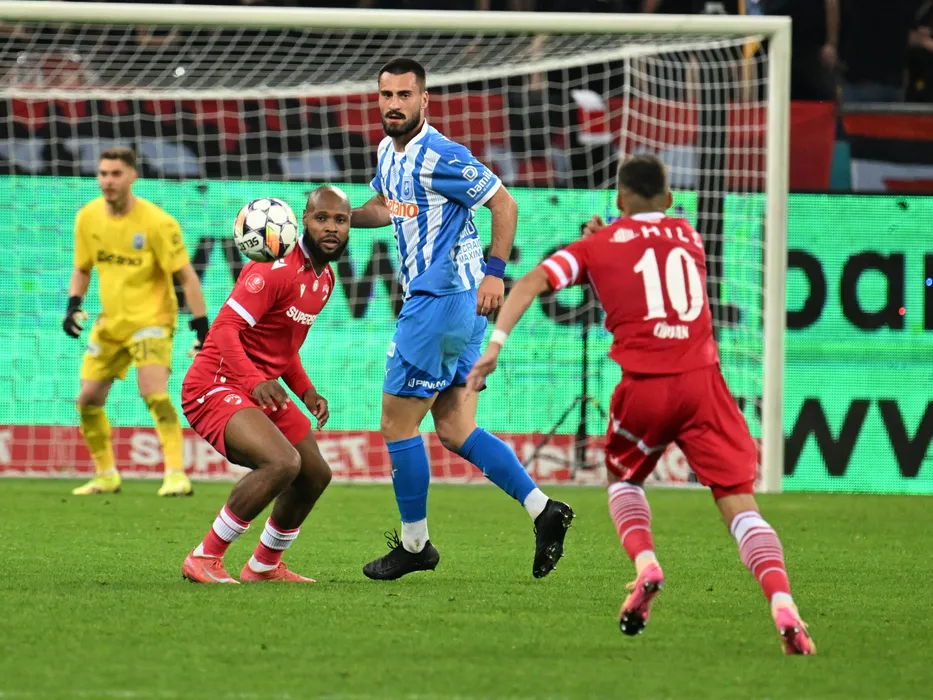 Hakim Djamel Abdallah si Gjoko Zajkov in meciul de fotbal dintre Dinamo Bucuresti si Universitatea Craiova, din cadrul Play off-ului Superligii Superbet, desfasurat pe Arena Nationala din Bucuresti, luni 21 aprilie 2025. © FOTO:Razvan Pasarica/SPORT PICTURES
