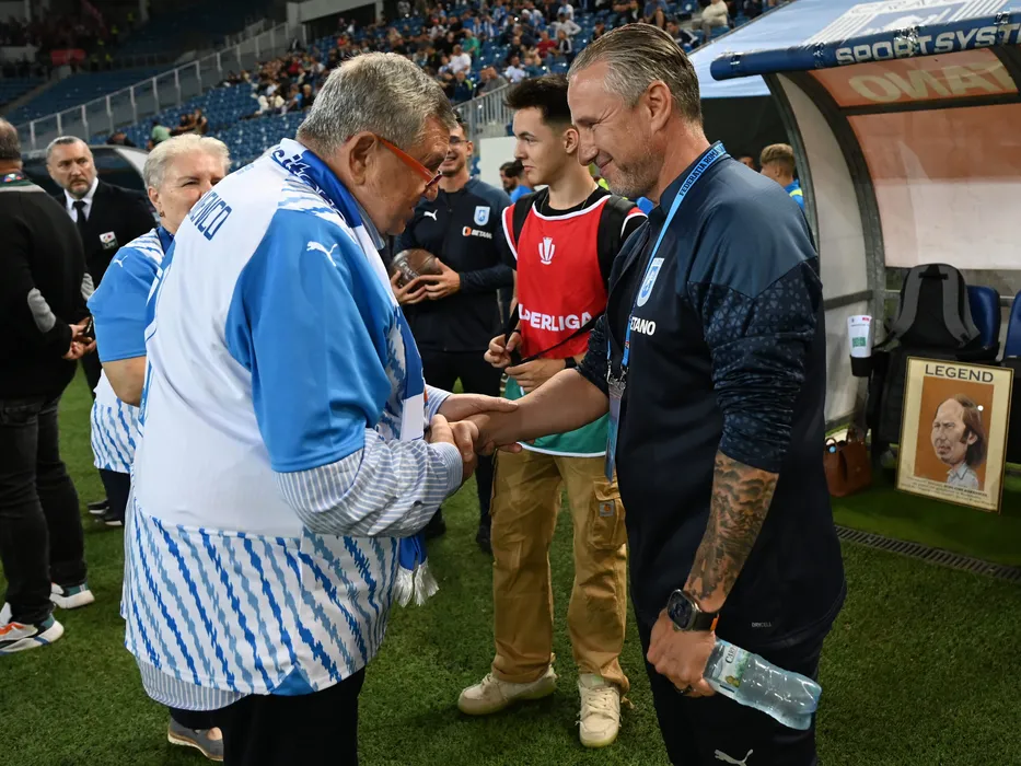 Jurnalistul Ion Jianu il saluta pe Laurentiu Reghecampf la meciul de fotbal dintre Universitatea Craiova si Sepsi OSK Sfantu Gheorghe, contand pentru Superliga Superbet, desfasurat pe Stadionul Ion Oblemenco din Craiova, sambata 16 septembrie 2023. © FOTO:Razvan Pasarica/SPORT PICTURES