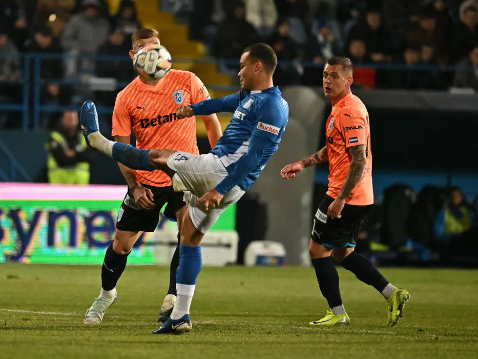 Gustavo Henrique Marins Silva si Alexandru Cicaldau in meciul de fotbal dintre Farul Constanta si Universitatea Craiova, contand pentru Superliga Superbet, desfasurat pe Stadionul central al Academiei Gheorghe Hagi din Ovidiu, luni 28 octombrie 2024. © FOTO:Razvan Pasarica/SPORT PICTURES