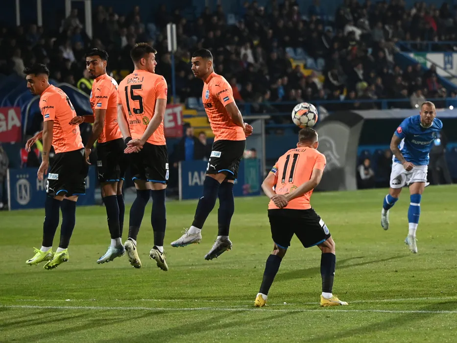 Denis Alibec executa o lovitura libera peste zidul craiovean format din Andrei Virgil Ivan, Ștefan Baiaram, Juraj Badelj, Screciu Vladimir Ionuț si Nicușor Silviu Bancu in meciul de fotbal dintre Farul Constanta si Universitatea Craiova, contand pentru Superliga Superbet, desfasurat pe Stadionul central al Academiei Gheorghe Hagi din Ovidiu, luni 28 octombrie 2024. © FOTO:Razvan Pasarica/SPORT PICTURES