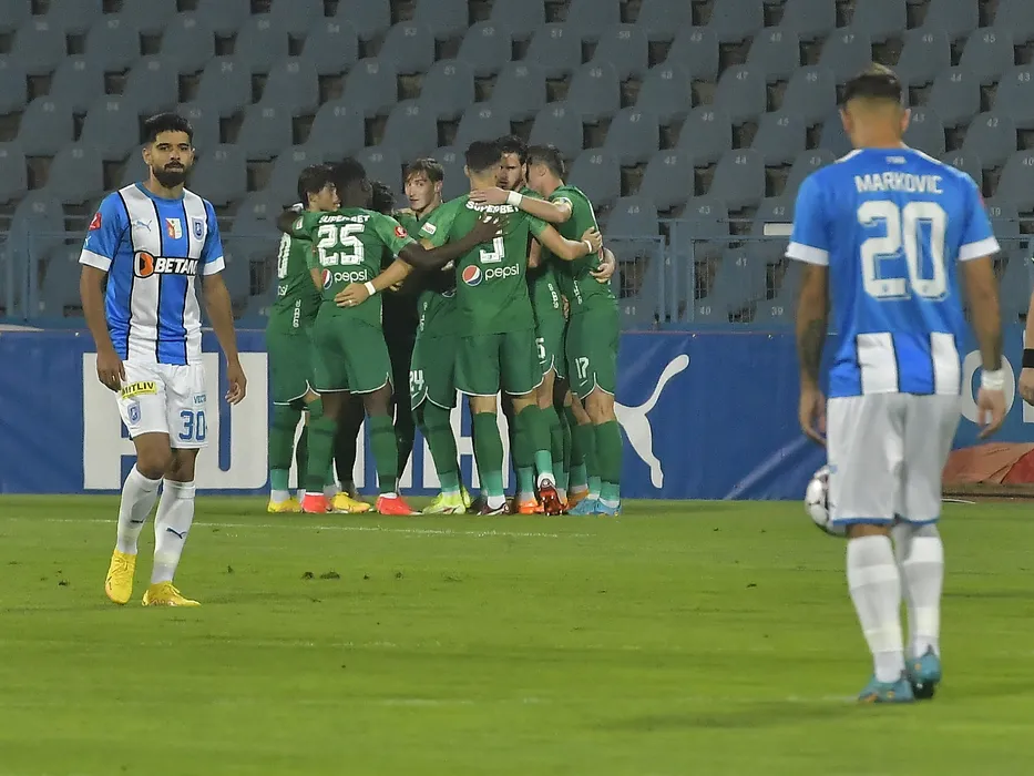 Bucurie a fotbalistilor constanteni cu Constantin Grameni si Tudor Cristian Baluta dupa un gol marcat sub privirile lui Ionut Daniel Vina in meciul de fotbal dintre Universitatea Craiova si Farul Constanta, contand pentru Superliga Superbet, desfasurat pe Stadionul Municipal din Drobeta Turnu Severin, luni 5 septembrie 2022. © FOTO:Razvan Pasarica/SPORT PICTURES