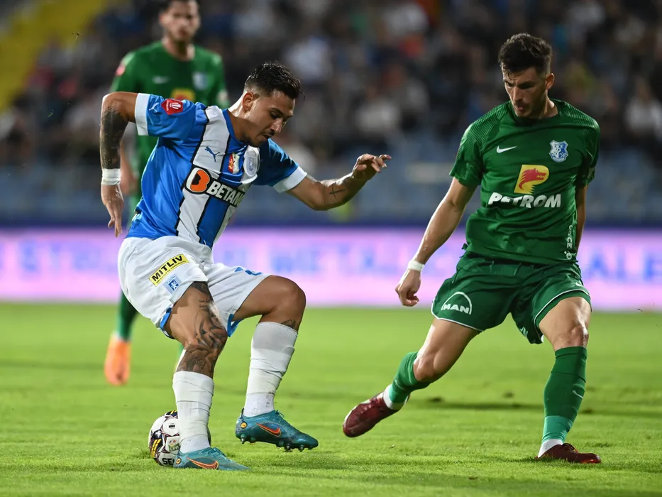 Jovan Markovic si Mihai Popescu in meciul de fotbal dintre Universitatea Craiova si Farul Constanta, contand pentru Superliga Superbet, desfasurat pe Stadionul Municipal din Drobeta Turnu Severin, luni 5 septembrie 2022. © FOTO:Razvan Pasarica/SPORT PICTURES