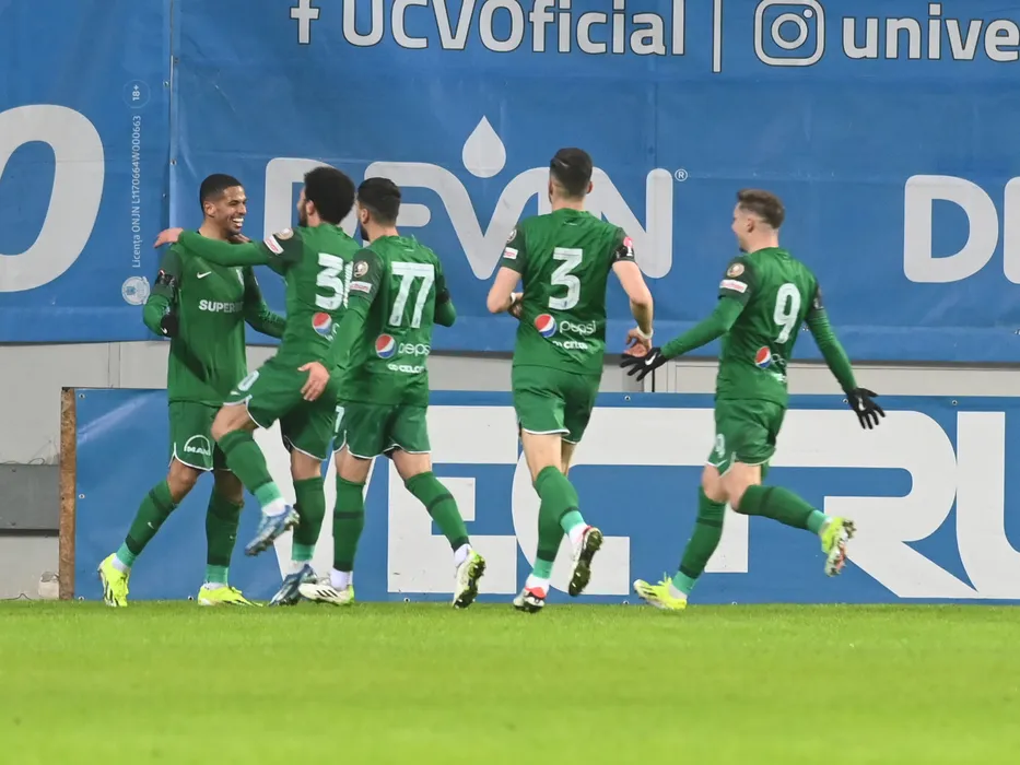 Bucurie a fotbalistilor constanteni dupa un gol marcat cu Rivaldinho (Mosca Rivaldo Vitor Ferreira), Narek Grigoryan si Louis Munteanu în meciul de fotbal dintre Universitatea Craiova si Farul Constanta, contând pentru Superliga Superbet, desfășurat pe Stadionul Ion Oblemenco din Craiova, duminica 21 ianuarie 2024. © FOTO: Răzvan PĂSĂRICĂ/SPORT PICTURES