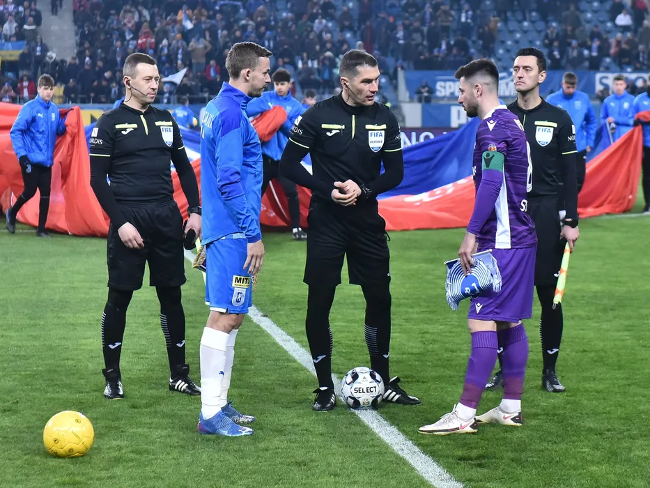 Brigada de arbitrii formata din Alexandru Cerei, Istvan Kovacs si Ovidiu Artene alaturi de capitanii Nicusor Silviu Bancu si Ionut Adrian Serban la startul meciului de fotbal dintre Universitatea Craiova si FC Arges, contand pentru Play-off-ul Ligii 1 Casa Pariurilor, desfasurat pe Stadionul Ion Oblemenco din Craiova, vineri 11 martie 2022. © FOTO:Razvan Pasarica/SPORT PICTURES