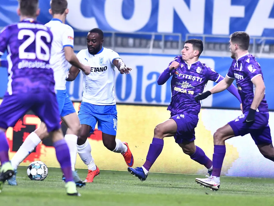 Reagy Ofosu si Costinel Andrei Tofan in meciul de fotbal dintre Universitatea Craiova si FC Arges, contand pentru Liga 1 Casa Pariurilor, desfasurat fara spectatori pe Stadionul Ion Oblemenco din Craiova, vineri 29 ianuarie 2021. © FOTO:Razvan Pasarica/SPORT PICTURES