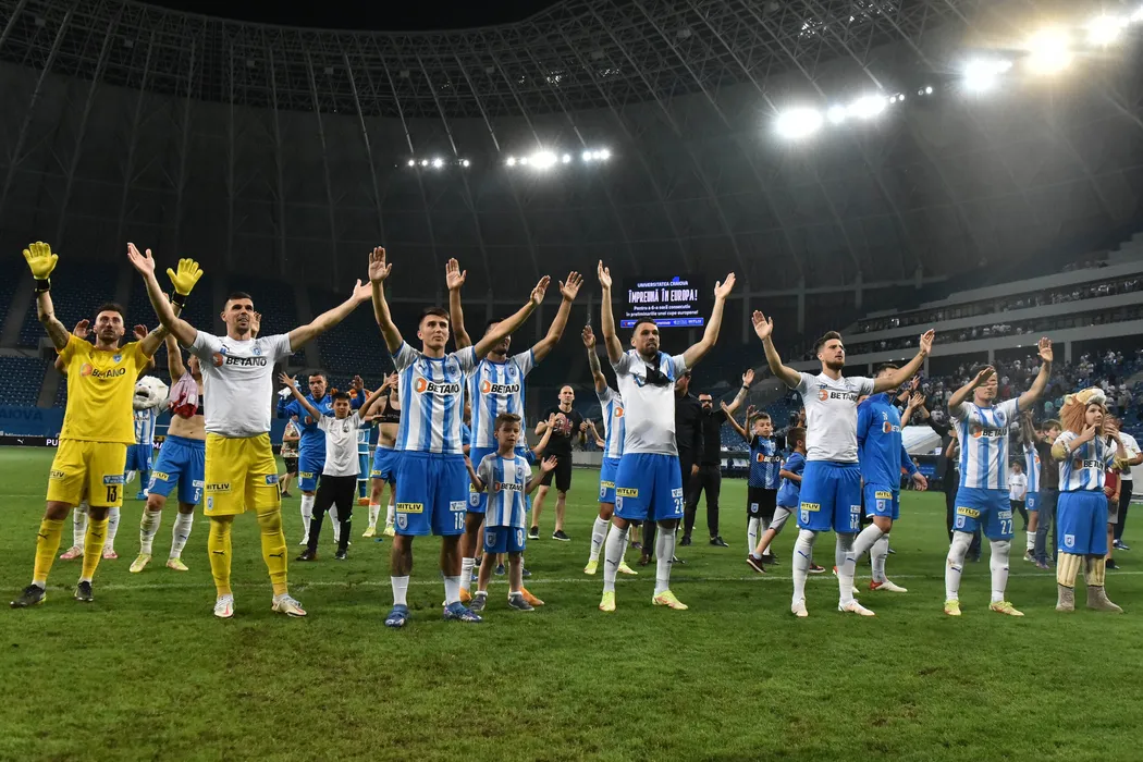 Fotbalistii craioveni Mirko Pigliacelli, David Beniamin Lazar, Stefan Marinel Vladoiu, Valerica Marius Gaman, Mihai Cristian Capatina si Gustavo Vagenin , alaturi de tabela de marcaj pe care sta scris: "Impreuna in Europa!", saluta galeria dupa meciul de fotbal dintre Universitatea Craiova si FC Botosani, contand pentru Barajul Europa Conference League, desfasurat pe Stadionul Ion Oblemenco din Craiova, vineri 27 mai 2022. © FOTO:Razvan Pasarica/SPORT PICTURES