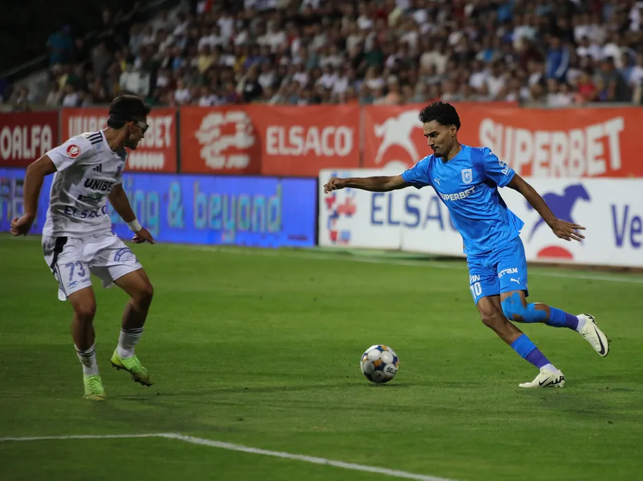 Stefan Baiaram si Narcis Cosmin Ilas in meciul de fotbal dintre FC Botosani si Universitatea Craiova, contand pentru Superliga Superbet, desfasurat pe Stadionul Municipal din Botosani, duminica 31 august august 2025. © FOTO:Ionut Tabultoc/SPORT PICTURES