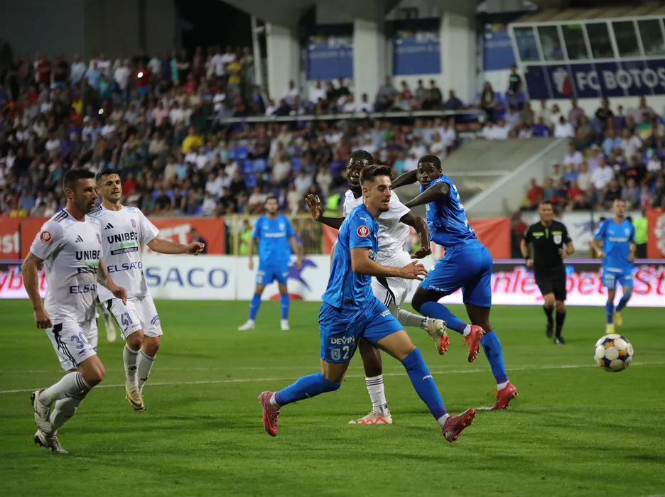 David Andrei Barbu, Aimé Steven Nsasa Nsimba si Alexandru Tiganasu, Ioan Andrei Vasile Dumiter in meciul de fotbal dintre FC Botosani si Universitatea Craiova, contand pentru Superliga Superbet, desfasurat pe Stadionul Municipal din Botosani, duminica 31 august august 2025. © FOTO:Ionut Tabultoc/SPORT PICTURES
