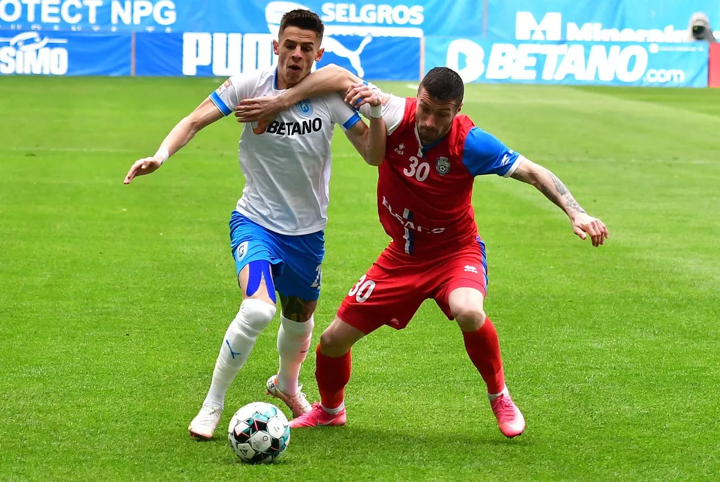 Alexandru Tiganasu (D), de la FC Botosani, lupta pentru balon cu George Campanu (S), de la Universitatea Craiova, in meciul de fotbal din etapa a XXVI-a a Ligii 1, disputat pe Stadionul Ion Oblemenco din Craiova, sambata, 6 martie 2021. REMUS BADEA / MEDIAFAX FOTO