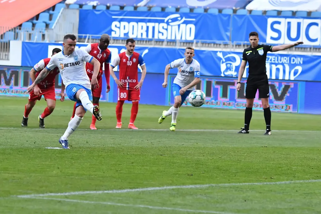 Dan Nistor (S), de la Universitatea Craiova, inscrie un gol in timpul meciului de fotbal contra echipei FC Botosani din etapa 7 a play-off-ului Ligii 1, disputat pe stadionul Ion Oblemenco din Craiova, duminica, 9 mai 2021. REMUS BADEA / MEDIAFAX FOTO