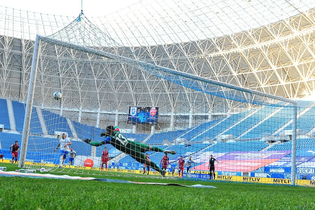 Dan Nistor (S), de la Universitatea Craiova, inscrie un gol in timpul meciului de fotbal contra echipei FC Botosani din etapa 7 a play-off-ului Ligii 1, disputat pe stadionul Ion Oblemenco din Craiova, duminica, 9 mai 2021. REMUS BADEA / MEDIAFAX FOTO