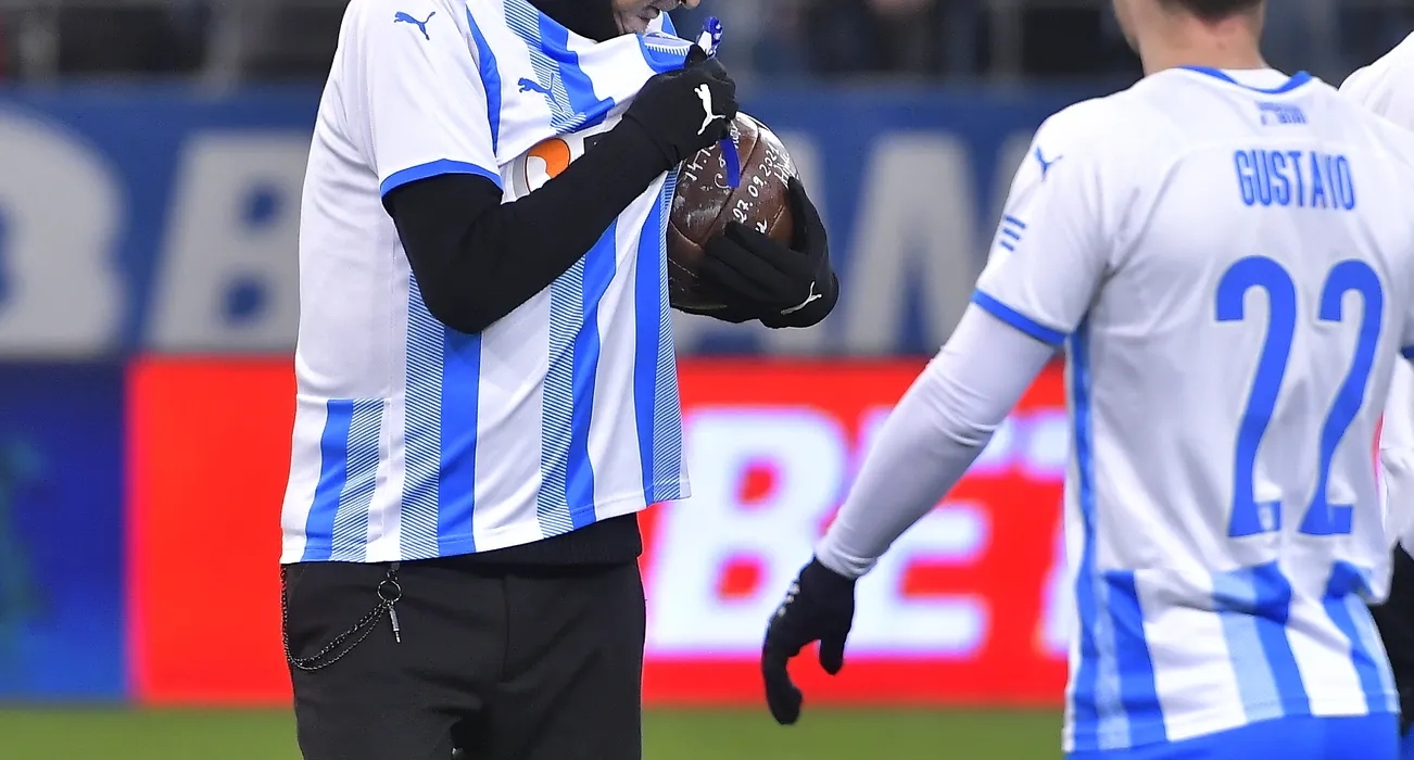 Gica Craioveanu saruta sigla clubului la meciul de fotbal dintre Universitatea Craiova si FC U Craiova, contand pentru Liga 1 Casa Pariurilor, desfasurat pe Stadionul Ion Oblemenco din Craiova, luni 14 februarie 2022. © FOTO:Razvan Pasarica/SPORT PICTURES