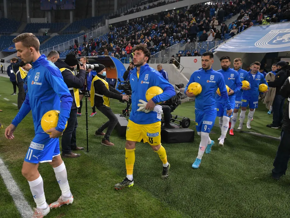 Fotbalistii craioveni Nicusor Silviu Bancu, Mirko Pigliacelli si Andrei Virgil Ivan la startul meciului ies pe teren la meciul de fotbal dintre Universitatea Craiova si FC U Craiova, contand pentru Liga 1 Casa Pariurilor, desfasurat pe Stadionul Ion Oblemenco din Craiova, luni 14 februarie 2022. © FOTO:Razvan Pasarica/SPORT PICTURES