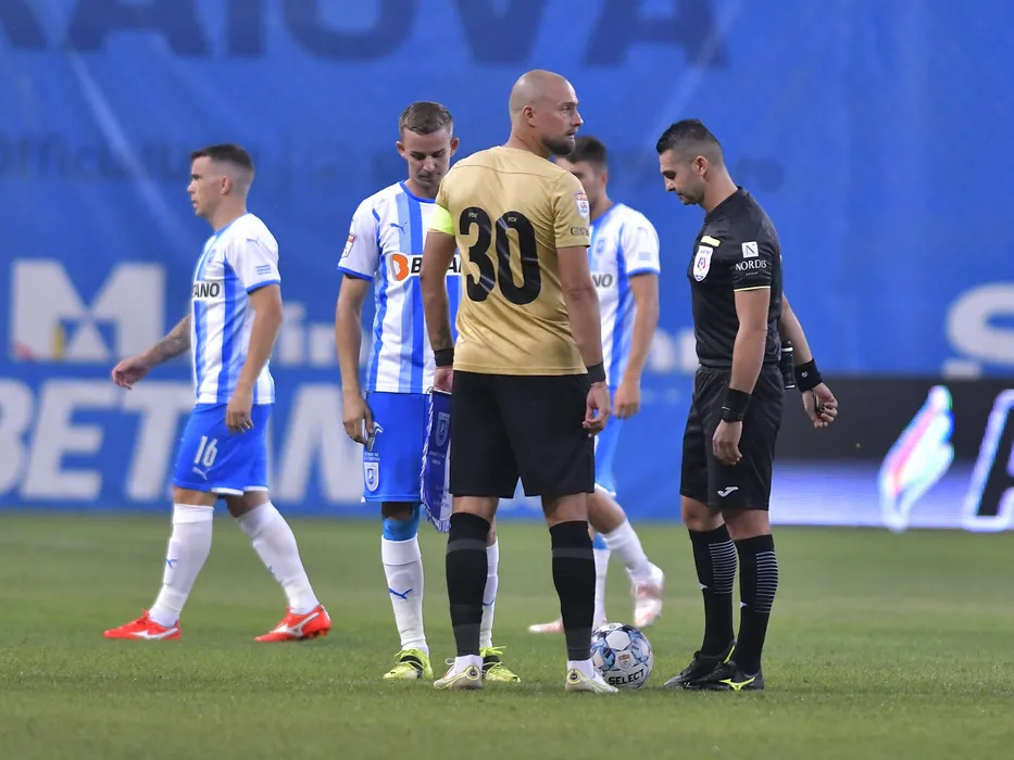 Arbitrul central Iulian Calin alaturi de capitanii Nicusor Silviu Bancu si Gabriel Sebastian Tamas in meciul de fotbal dintre Universitatea Craiova si FC Voluntari, contand pentru Liga 1 Casa Pariurilor, desfasurat pe Stadionul Ion Oblemenco din Craiova, luni 9 august 2021. © FOTO:Razvan Pasarica/SPORT PICTURES
