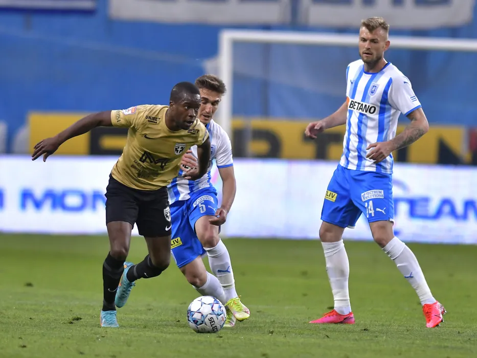 Ulrich Sidoine Meleke, Bogdan Ilie Vatajelu si Alexandru Cretu in meciul de fotbal dintre Universitatea Craiova si FC Voluntari, contand pentru Play-off-ul Ligii 1 Casa Pariurilor, desfasurat pe Stadionul Ion Oblemenco din Craiova, sambata 30 aprilie 2022. © FOTO:Razvan Pasarica/SPORT PICTURES