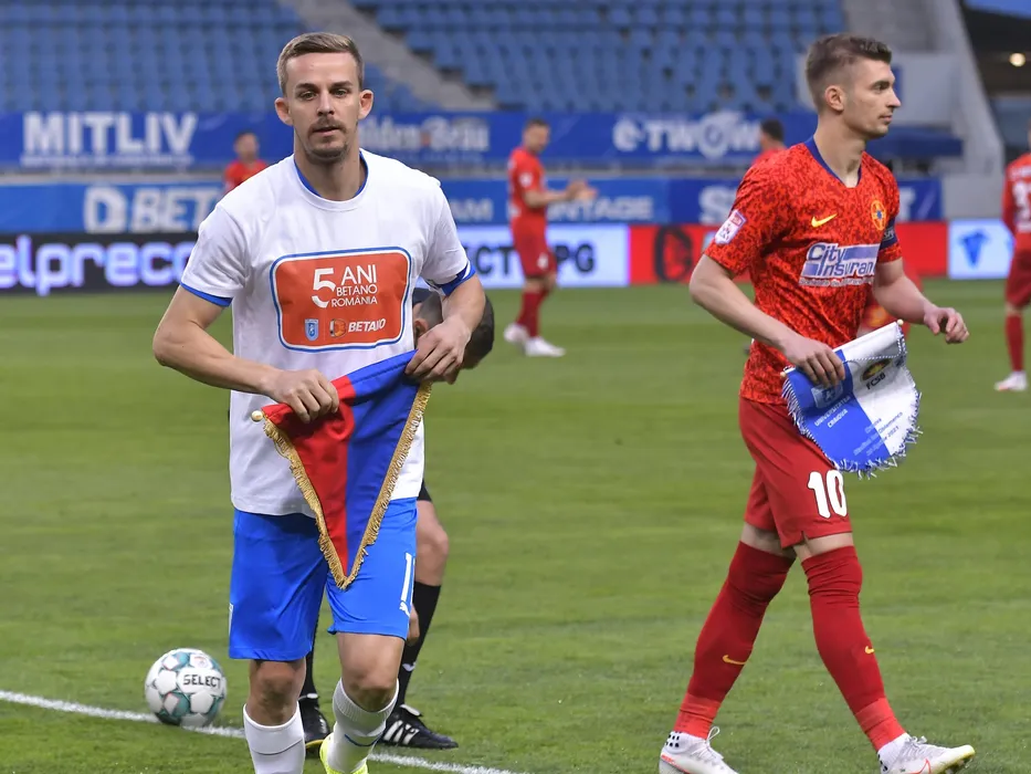 Nicusor Silviu Bancu si Florin Lucian Tanase in meciul de fotbal dintre Universitatea Craiova si FCSB, contand pentru Play-off-ul Ligii 1 Casa Pariurilor, desfasurat fara spectatori pe Stadionul Ion Oblemenco din Craiova, joi 29 aprilie 2021. © FOTO:Razvan Pasarica/SPORT PICTURES